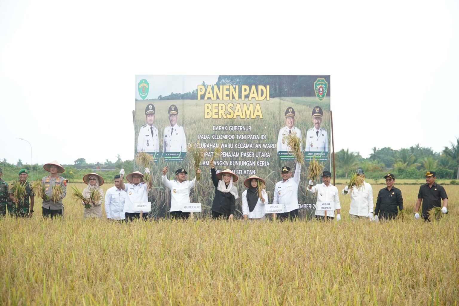 TAKAMEDIA.ID, PENAJAM – Bupati Penajam Paser Utara (PPU) Mudyat Noor mendampingi Gubernur Kalimantan Timur (Kaltim) Rudy Mas’ud bersama Wakil Gubernur Kaltim Seno Aji dalam kegiatan panen padi di lahan pertanian Kelompok Tani Padaidi, Kelurahan Waru, Kamis (18/9/2025).